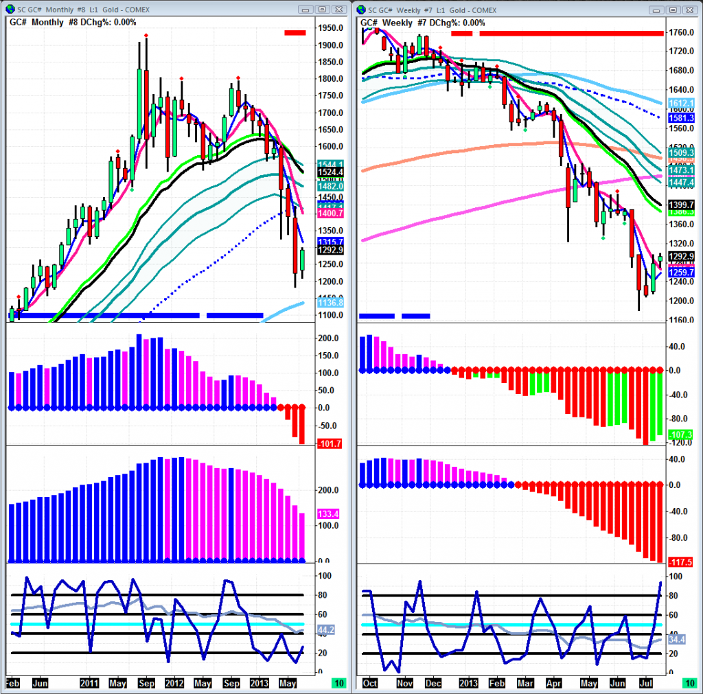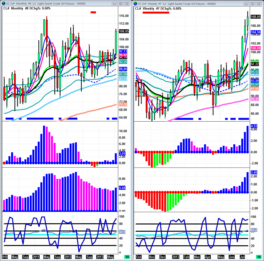 Well crude is definitely holding up its end of the bargain. Another week in the green with some strong indications. My only problem is the magenta that showed up on Friday’s bar, confirmation of a correction will come when we get under the fast averages. If that doesn’t happen then I’m looking to test and maybe even break $110. On a weekly and monthly basis it couldn’t look better, which is why I don’t mind a daily pullback to get some new buyers interested. Something I look at in emerging trends is the slow trigger on the weekly and daily. Both of them are in top shape, especially that weekly. It went from a slow start to a steep slope, and that is perfect. When crude gets going like this it really likes to go fast unlike stock index futures. Bottom line: everything is perfect from a trend perspective across all timeframes.