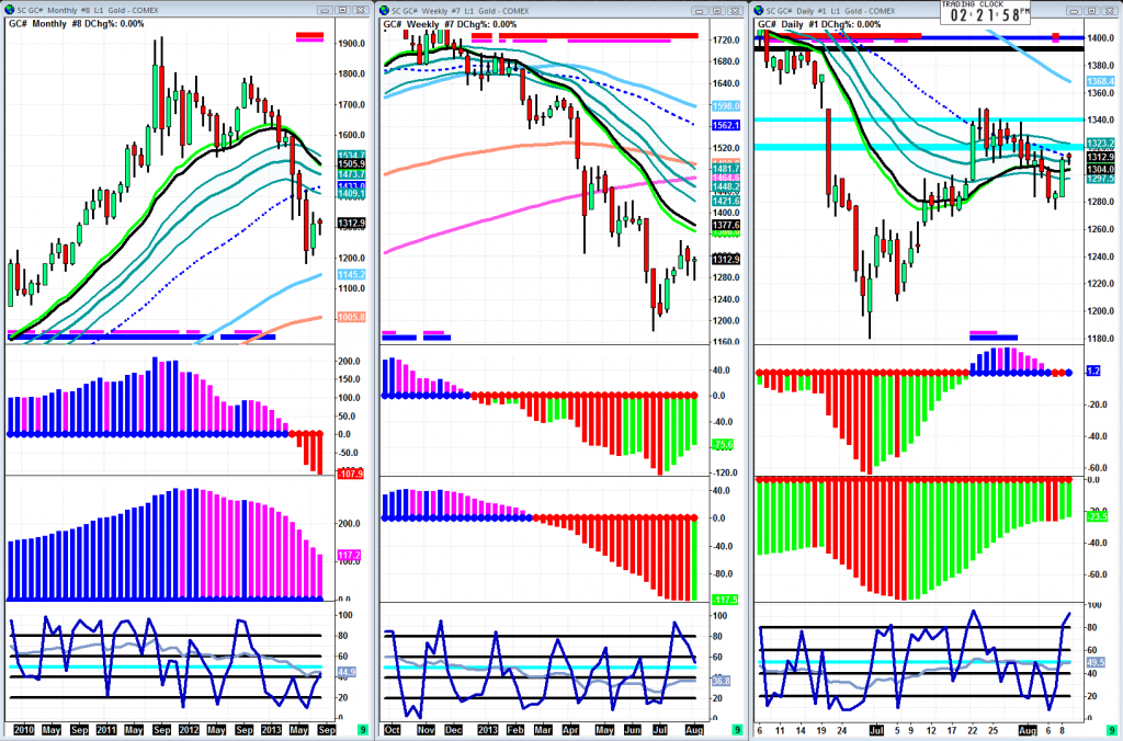 The first thing I’ll say here is that monthly bar is a pure and simple sell signal. Last weeks sell signal was sold at first until the bulls came in Friday and really tore it up on the job numbers. Bulls gave a good accumulation bar on Friday to work with, but gold is still a very “iffy” situation. No real clear direction now that buyers have started to come in but sellers are still in control. In the middle of the week I checked the weekly slow trigger and it had turned green, but sellers caused it to stay red. Monthly chart shows bears clearly in control with $1145 as a reasonable target, while the weekly chart is in a downtrend with a red slow trigger giving credit to sellers below last weeks low, and the daily chart got trapped in a key daily resistance level while still in a downtrend. So, $1385 can be a reasonable target above $1340 key resistance level and below Friday’s accumulation bar there is nothing but air and could even see new lows.