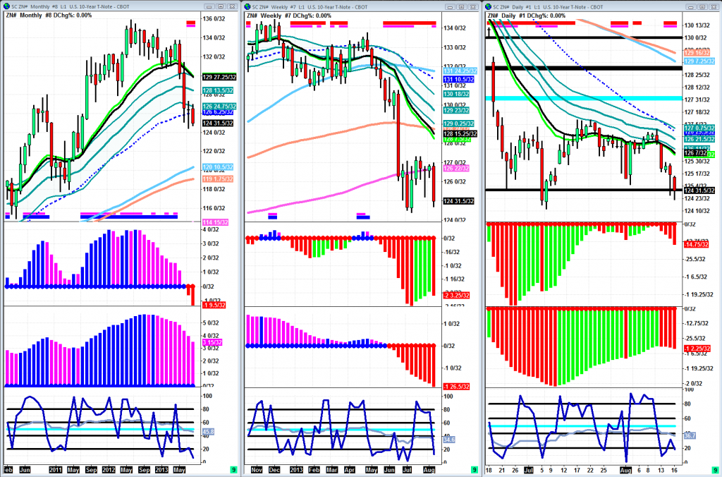 I think I have been quite clear on the fact that notes look like trash. Still do, but they look like gold to traders who don’t have a long bias. People that trade with no emotions unlike these bond managers that live in la-la land. Anyway, 125 is still a key level that needs to be broken as well as the July 8th low to see lower prices. Next key daily support level is 122 22/32. Weekly triggers and sell signals are still being sold aggressively. I honestly believe longer term bonds can see a lot lower, in the 119s. For now I will just be watching for July 8th low to be broken so we can see 122 22/32 in a jiffy. Keepin’ it real..
