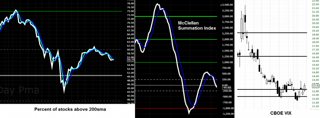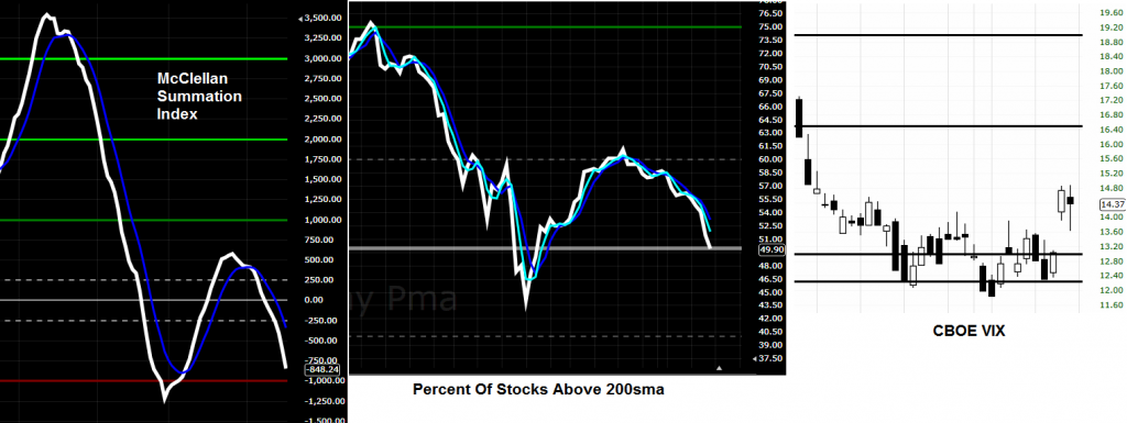 Internals really aren’t looking too hot and VIX is looking ready to take off. If there was real strength in this market during this last run, both McClellan Summation and Percent of Stocks Above 200 would be a lot higher than they are now. On top of that at the slightest bit of selling they are both turned down ready to tank. If the selling gets going, those two internals will be below the midpoint in no time. If they stay below the midpoint, especially if the market starts rallying again, then there will be a serious problem on my end.
