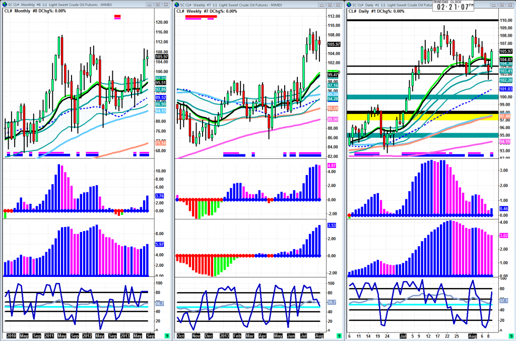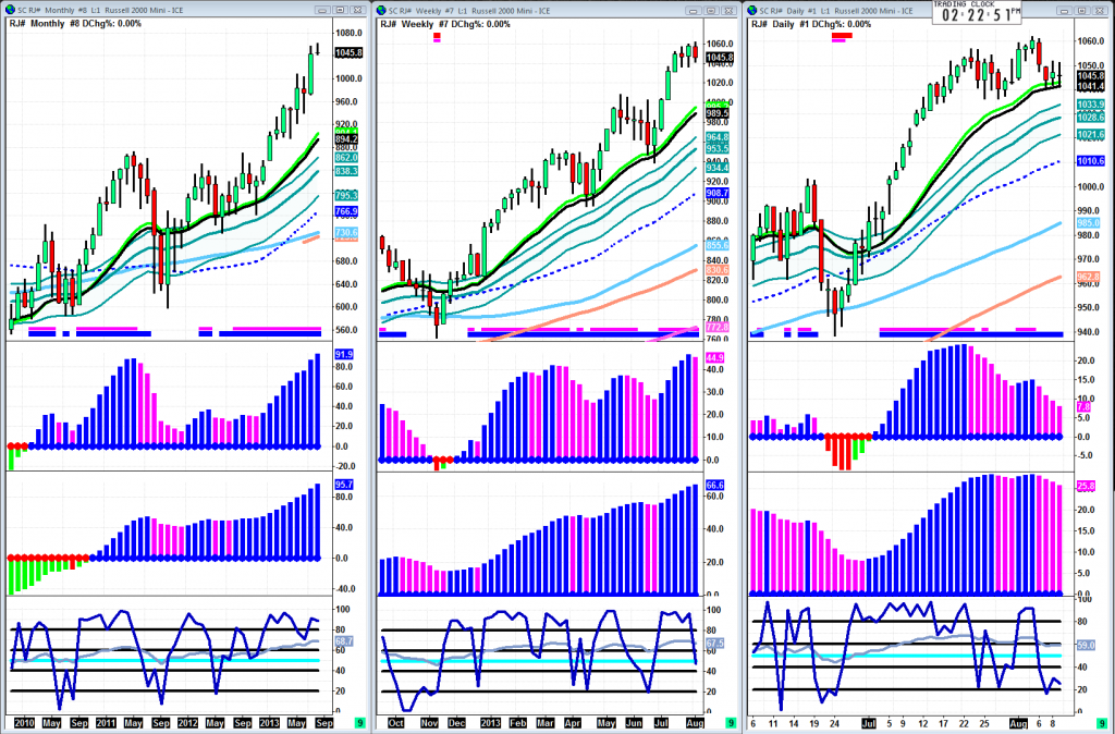 There are really no new signals to look at this week in the index futures, but we did get a failure pattern with a confirmed divergence on the daily charts. The S&P weekly chart divergence is also starting to play out with the fast trigger going magenta. The failure pattern being poking into new highs and coming back down showing that price wasn’t ready to break out again. I’m going to be watching the 20ema on the daily charts to be broken below to then get a test of the channel support and see how price reacts to that. You can see on the Russell monthly chart a pattern going on; one green month, one red month (consolidation). If that continues, this month is going to be the red consolidation month. Market internals are showing that to be a strong possibility. Looking at the weekly charts, every stochastic spike down has been bought and price is working on giving another one of those signals. This weeks price action will be a key factor in how that plays out. Also note the daily slow triggers, showing very clear loss of momentum. Bottom line is no trade signals this week but I am watching for one to form and that would entail breaking below the daily 20ema or $1040 level giving a nice sell off.