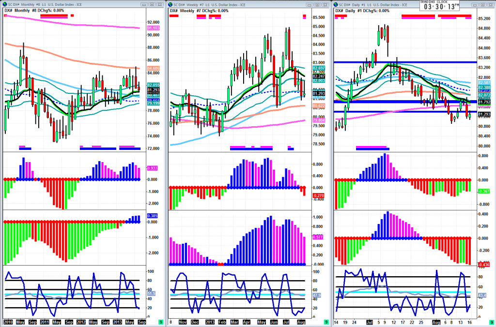 I wanted to include the Euro this week because of the very interesting spot it’s in. 1.3400 is a key level but it is also the weekly long term trend support level. Obviously there is more data for the dollar so I like to take a look at that as well when doing Euro analysis, and the dollar is in a strong long term down trend. I will post the chart after this. So, if 1.3400 gets broken I am going to be watching for 1.3500 to be broken as well at which point there is fairly open air up to 1.3700-1.3800. This would be very good for gold since bonds, dollar & equities will be falling as crude is rallying. It might also possibly wake up some politicians if this scenario were to play out. Also think about that for a second. Bonds, dollar, and equities falling as crude and gold are rising… conspiracy theory? Anyway, triggers across the time frames are also set up for a break of 1.3400, so it isn’t unlikely that it will happen.