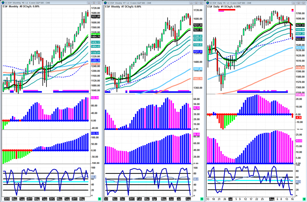 On last weeks recap I mentioned the failure patterns in the indices and looking for the daily 20ema to be broken to see how price reacts to the midpoint of the channel support. Price broke through it like it wasn’t even there, that tells me there is some real weakness here. Next level to be watching on the Russell is the 50sma on the daily charts (S&P already slightly broke 50sma) and after that $990 area. I do expect the weakness to continue this week as the market internals are showing no signs of life, those will be posted at the end. $1625 will be an important area to watch as it is daily long term trend support level and weekly 20ema. Something I just noticed this weekend is that failure pattern I have been talking about also is happening on the weekly chart of the S&P. If you draw a line from the May highs you will see price broke above it for a short period of time, couldn’t hold, and failed just like it did on the daily chart. If that $1625 level fails I will be watching $1600 then $1580 for reactions. Also note that S&P weekly divergence is playing out as well as daily indicators going negative. Even monthly fast trigger is starting to show early signs of weakness.